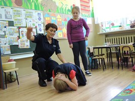 Uczniowie bardzo serdecznie powitali gościa i z zainteresowaniem słuchali krótkiej pogadanki z zakresu bezpieczeństwa, której celem było kształtowanie prawidłowych postaw i zachowań wśród najmłodszych. Spotkanie przebiegało w bardzo miłej atmosferze. Pani Policjantka przybliżyła dzieciom zasady bezpiecznego poruszania się po drodze, zasady bezpieczeństwa podczas zabaw poza szkołą i w domu oraz zasady ograniczonego zaufania w stosunku do obcych. Uczniowie słuchali z uwagą, brali czynny udział scenkach dramatycznych. Wykazywali się również dobrą znajomością zasad ruchu drogowego i bezpieczeństwa na ulicy.